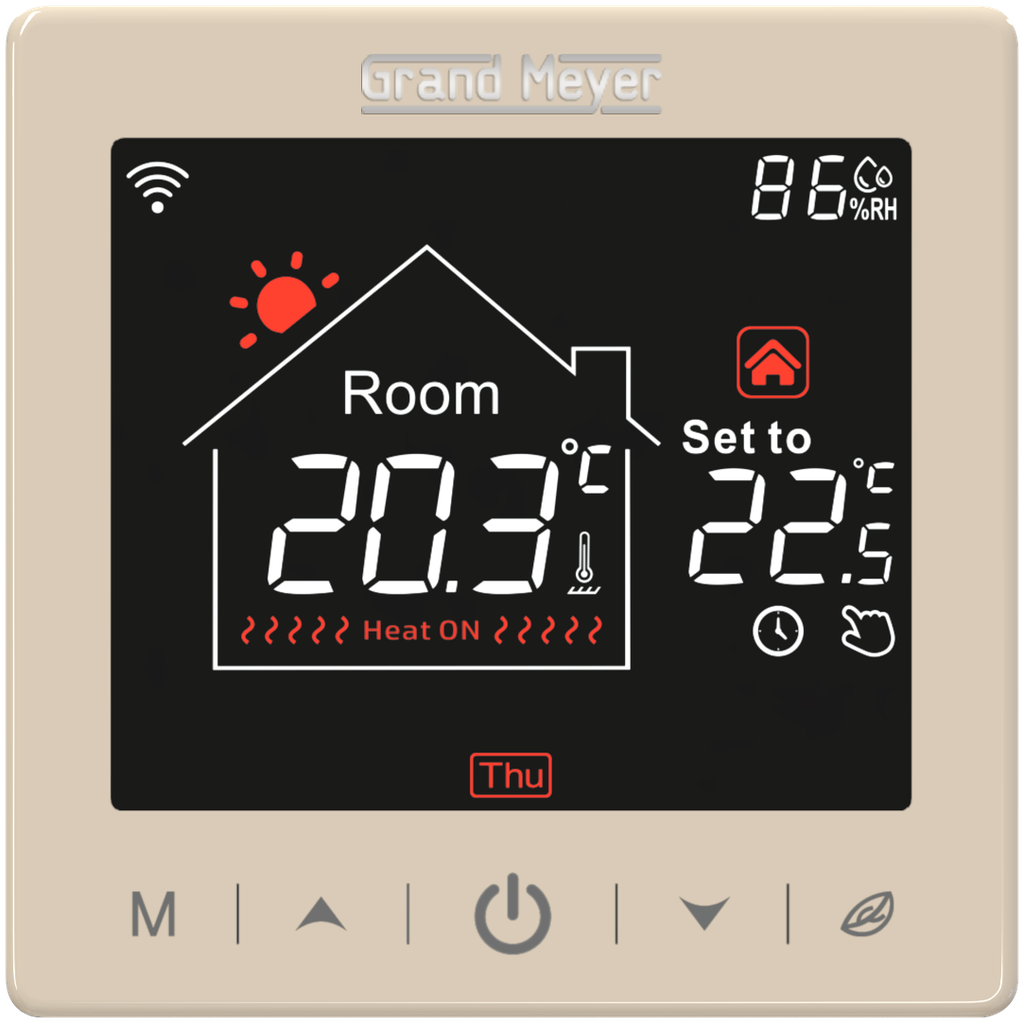 Grand Meyer SN series - сенсорный программируемый терморегулятор с функцией удаленного доступа по сети Wi-Fi для управления теплым полом. Терморегулятор автоматически поддерживает заданную температуру обогреваемой поверхности по показаниям датчика температуры пола (входит в комплект поставки) или по показаниям датчика температуры окружающего воздуха (встроен в регулятор), или в комбинации обоих датчиков. Имеет функцию прогноза погоды. Регулятор приспособлен для скрытого (утопленного) монтажа в гнезде стандартной монтажной коробки.